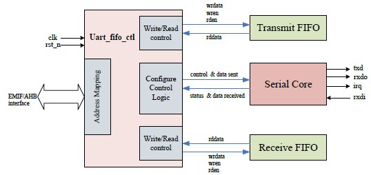 通用异步收发传输器(UART),该协议提供两种传输接口连接 EMIF 总线和 AHB 总线,用于8051内核和 ARM 内核之间的通信。这两种接口为全双工的串行通信接口。