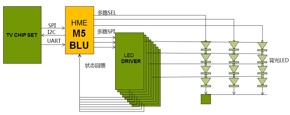 方案基于M5/HR FPGA,HME BLU 接收 TV chip 通过 SPI 发送的背光指令,BLU 解析指令并并行驱动多路 SEL 和多路 SPI 驱动 LED Driver 点亮背光 LED。