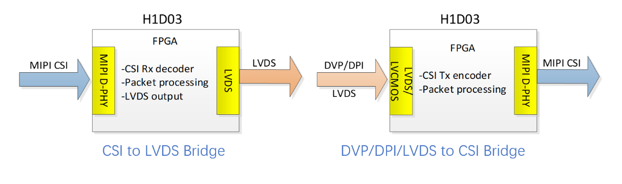实现定制化功能,主控平台需要支持不同种类的 Sensor,希望帧格式尽可能的统一,但不同 Sensor 还是会有差别,经过 H1D03 的处理可消除不同传感器带来的帧格式差异,降低主控开发难度,节约开发周期,接口转换 IC 难以实现全方位技术支持,可提供全套 MIPI CSI Rx/Tx 以及 LVDS 接口相关的参考代码。